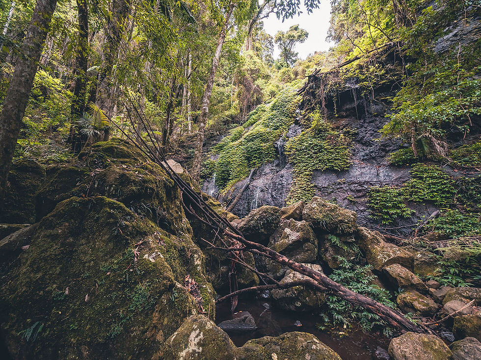 The circuit then follows the creek, crossing it several times and passing countless cascades. A standout feature of the walk is Cascade Falls, where the water rushes through a series of deep pools before tumbling over the edge of a large rock face and cascading through foliage to the pools below.