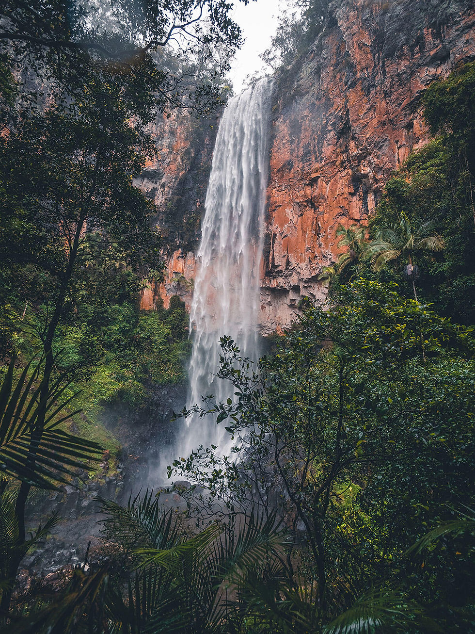 The walk features Purling Brook Falls, a 106m high single-drop fall that plummets into a beautiful pool at its base. The curved cliff line that envelopes the falls only adds to the scale.